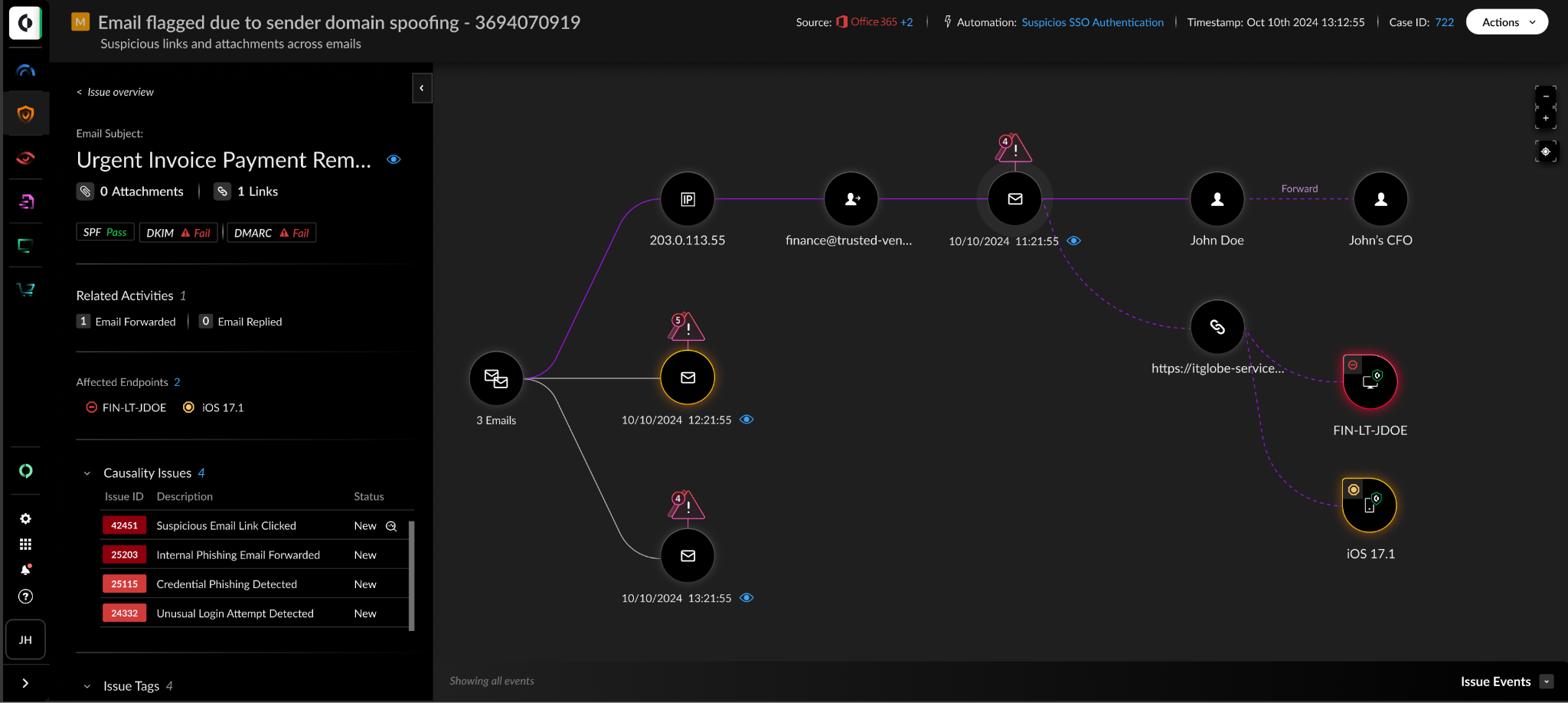 이메일, ID, 엔드포인트 및 네트워크에서 수집한 풍부한 데이터를 연관시켜 전체 공격 경로를 분석함으로써 탐지 및 대응 시간을 단축합니다.