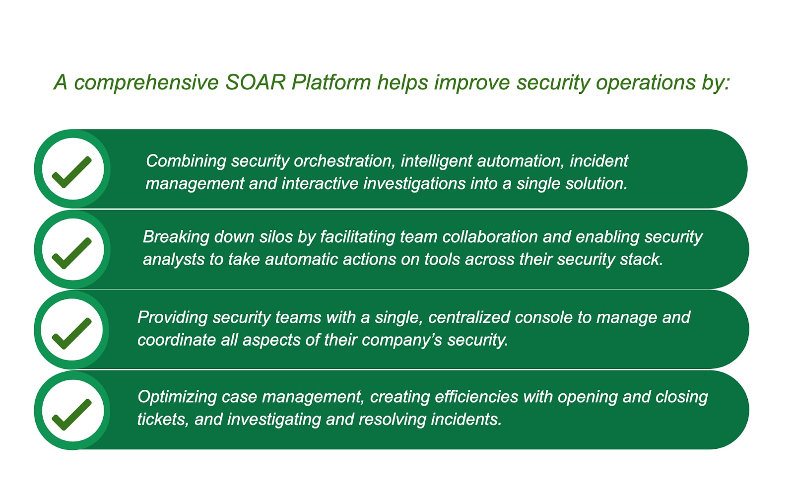 기업과 조직은 모든 유형의 보안 인시던트의 영향을 최소화하는 동시에 기존 보안 투자 가치를 극대화하고 법적 책임의 리스크와 비즈니스 다운타임을 전반적으로 감소시키는 SOAR의 가치를 발견하고 있습니다. 기업은 SOAR을 통해 다음을 실현함으로써 보안 문제를 해결 및 극복합니다.